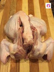Slice the bird in half using a sharp knife. Now you have 2 half chickens!